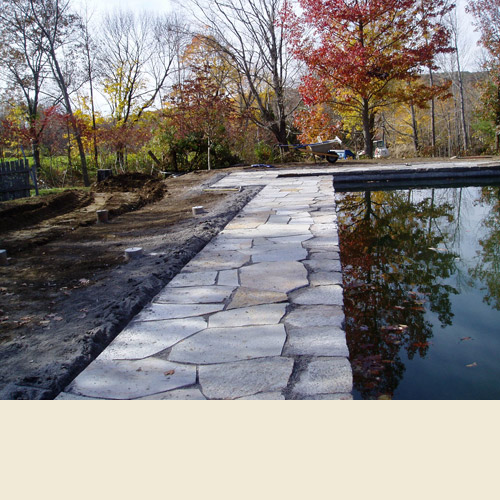 ![]() A rehabilitation of an historic property building walls using hand selected weathered fieldstone with bluestone walkways tied into large-cut flagging surrounding pool. |