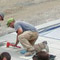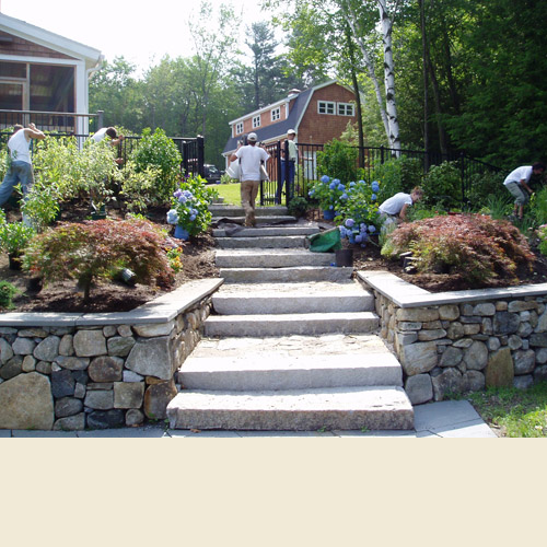 ![]() Contemporary lap pool with expansive blue stone patio, native fieldstone walls, old granite steps surrounded by seasonal color and architectural plantings. |